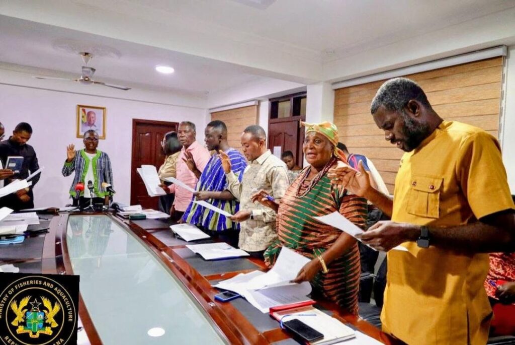 Swearing-In of members for Ministerial Committee for Development of Academic Curriculum For The Fisheries College at Anomabo featuring Prof. Berchie Asiedu of UENR and Fisheries Commission and Dr. Andrews Apraku, UENR.